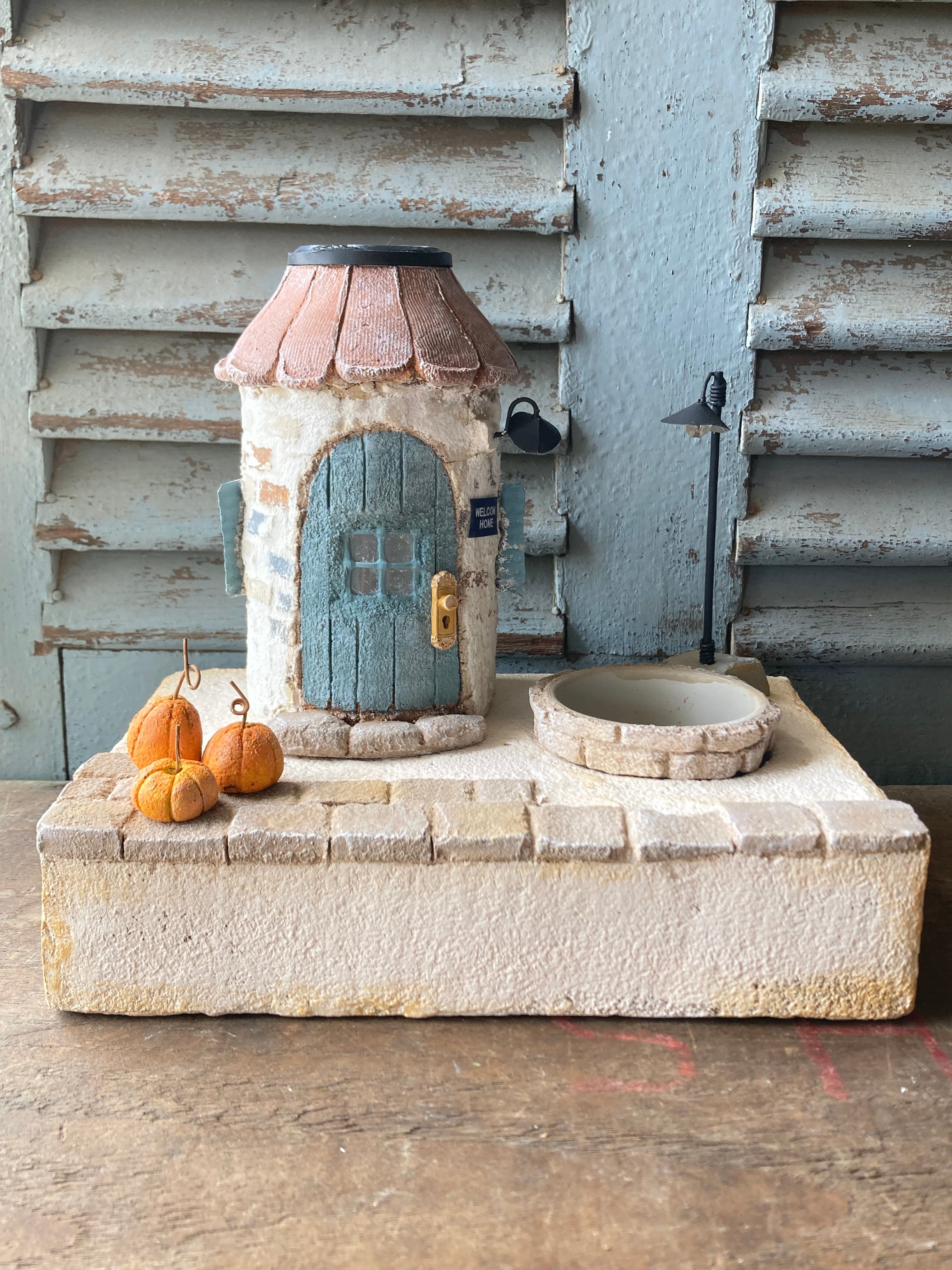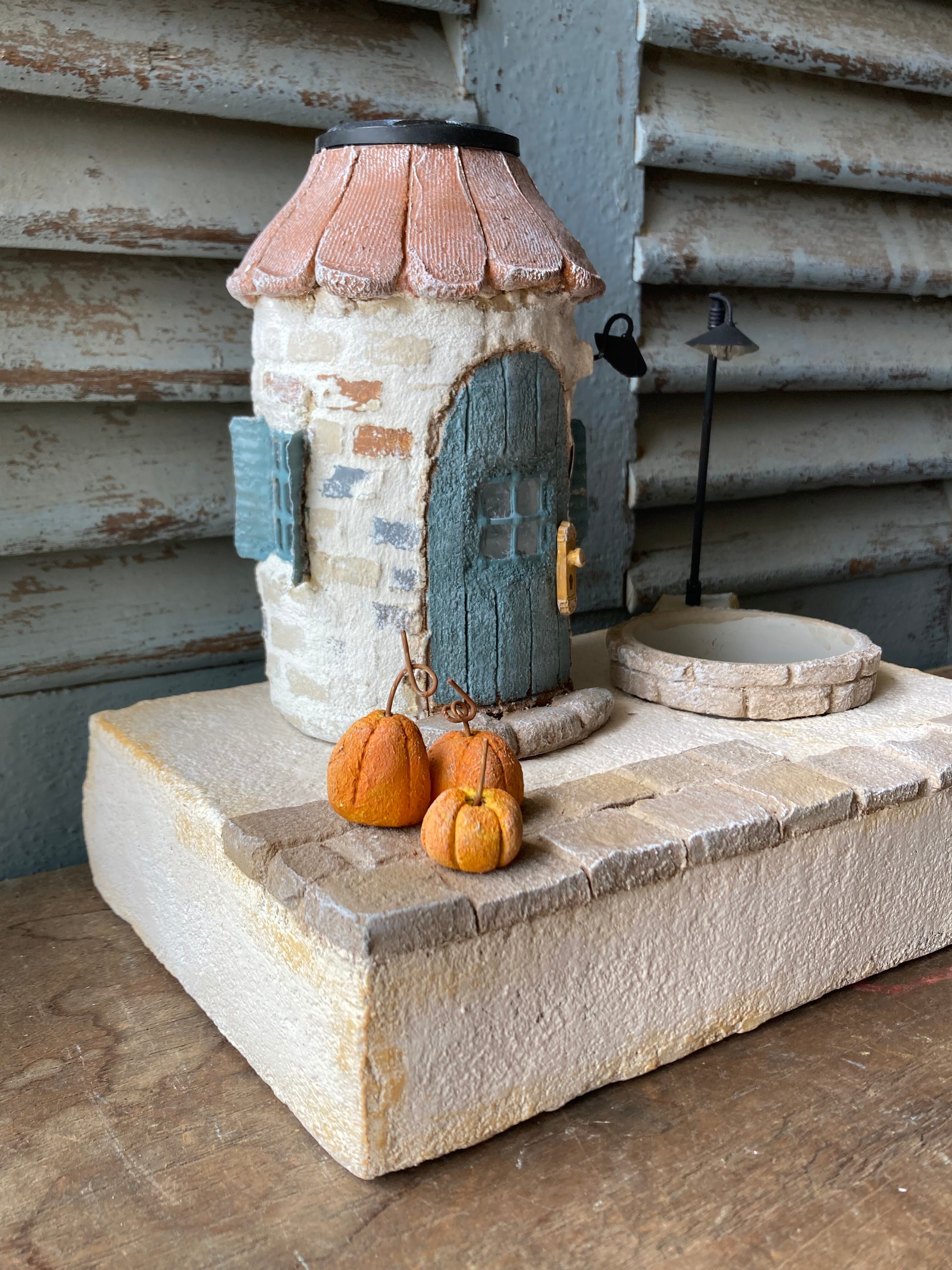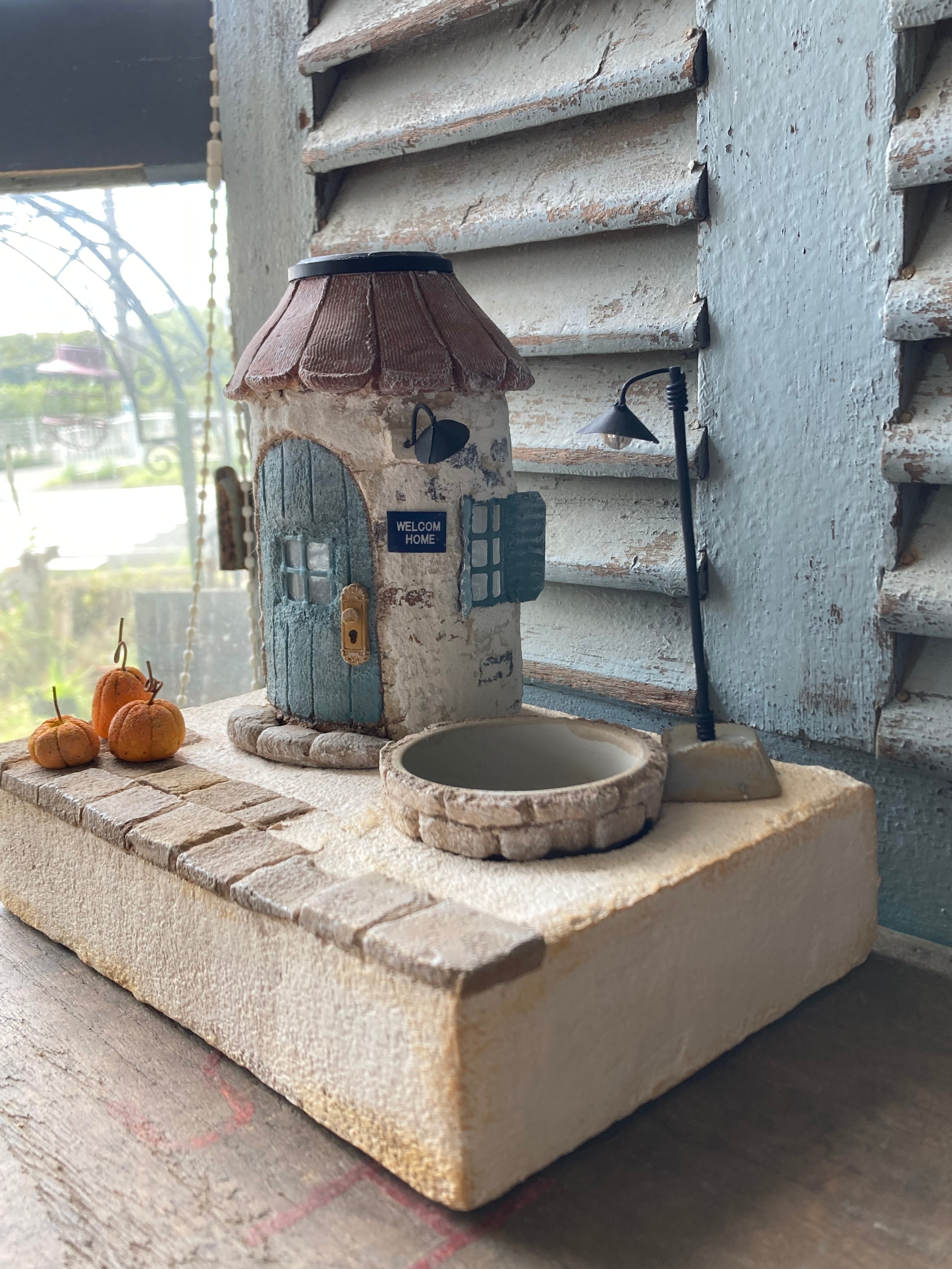 ソーラーライトのモルタルハウスとガーデンベース(ブルー)